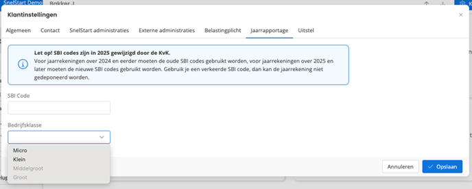 Voor ondernemingen is het mogelijk met de module Jaarrapportage om jaarrapporten en publicatiestukken op te stellen en in te dienen bij de Kamer van Koophandel. Bij SnelStart Relaties vul je bij de onderneming-klant het KvK-nummer in en door het invullen van de SBI-code en de bedrijfsklasse wordt o.a. de module Jaarrapportage actief.