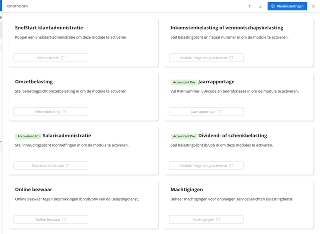 Je komt in het klantenoverzicht terecht dat je gebruikt voor aangiften, jaarrekeningen en salarisadministratie. Per klant geef je in de klantinstellingen aan of de klant belastingplichtig is, welke SBI-code van toepassing is, en eventuele andere relevante gegevens. Op basis hiervan wordt automatisch bepaald tot welke modules je voor die klant toegang hebt.
