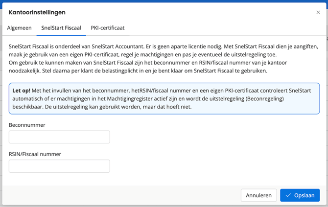 - Je ziet hier drie tabbladen: Algemeen, SnelStart Fiscaal en PKI-certificaat. We leggen hieronder per tabblad uit wat je daar invult.