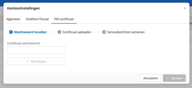 In dit tabblad kun je de gegevens van het PKI-certificaat invullen. Zie je nadat je het certificaat hebt geüpload niet meteen een datum? Log dan even opnieuw in en uit in SnelStart.