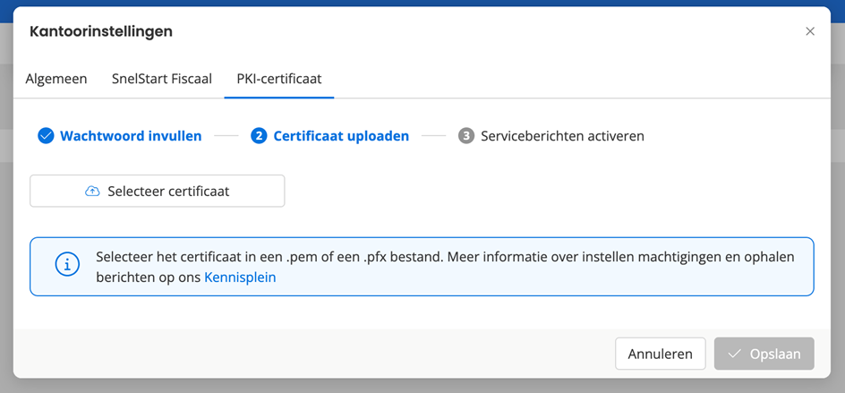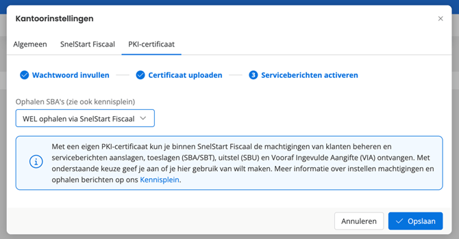 Je kunt er ook voor kiezen om in SnelStart een eigen PKI-overheidscertificaat te gebruiken. Dit moet een P12/PFX-certificaat zijn. Met een eigen certificaat kun je niet alleen aangiften indienen, maar ook: