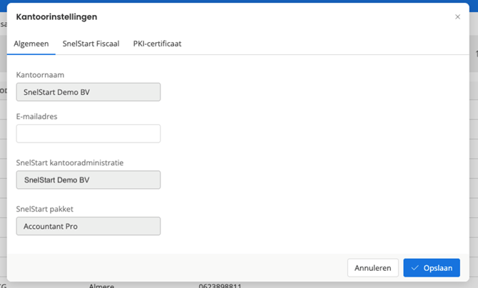 De kantoornaam wordt automatisch overgenomen vanuit Mijn SnelStart. Met het pakket Accountant heb je toegang tot Mijn SnelStart. De Algemene instellingen van je kantoor kun je daar wijzigen.