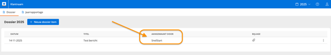 Wanneer er bijvoorbeeld bij een ingediende aangifte een (systeem)bericht wordt gegenereerd, staat dit vermeld onder ‘Aangemaakt door: SnelStart’.